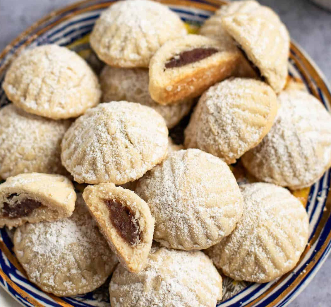 Delicate shortbread-like cookies filled with dates or walnuts, intricately shaped and dusted with powdered sugar.