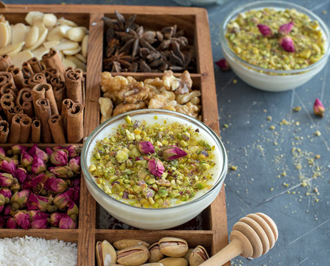 A creamy, silky milk pudding flavored with rosewater or orange blossom, topped with pistachios or coconut — a light and fragrant dessert that melts in your mouth.