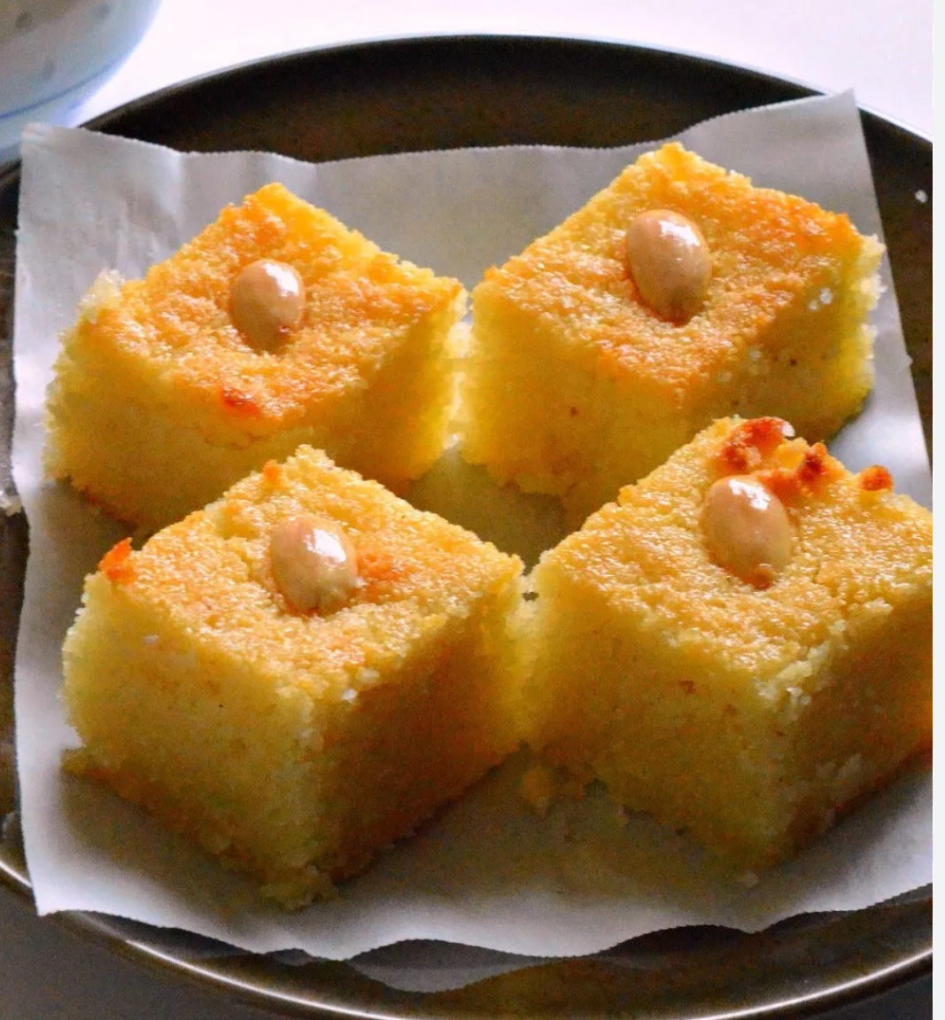 A moist semolina cake infused with coconut and yogurt, baked to perfection, and soaked in a fragrant sugar-rose syrup — a sweet, tender treat with a hint of richness.