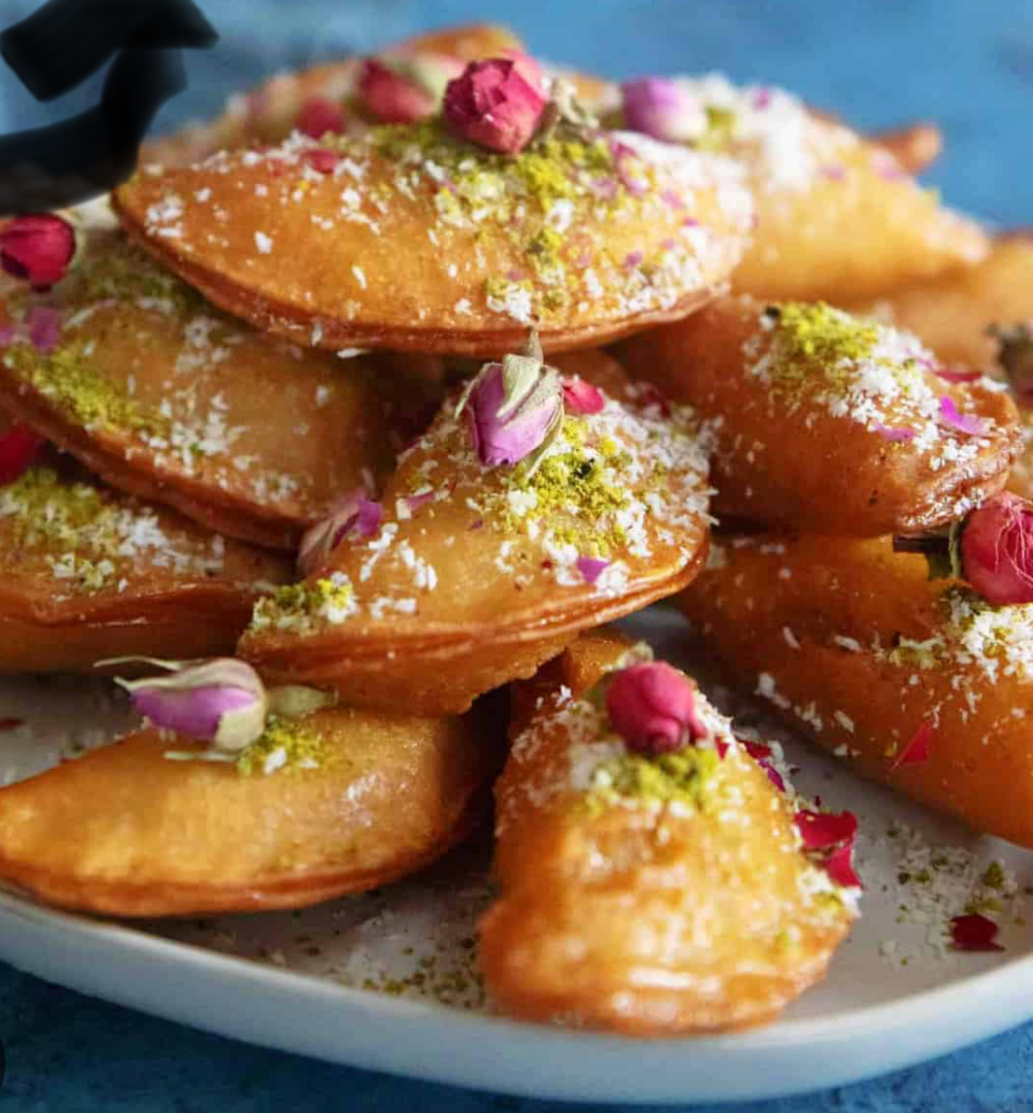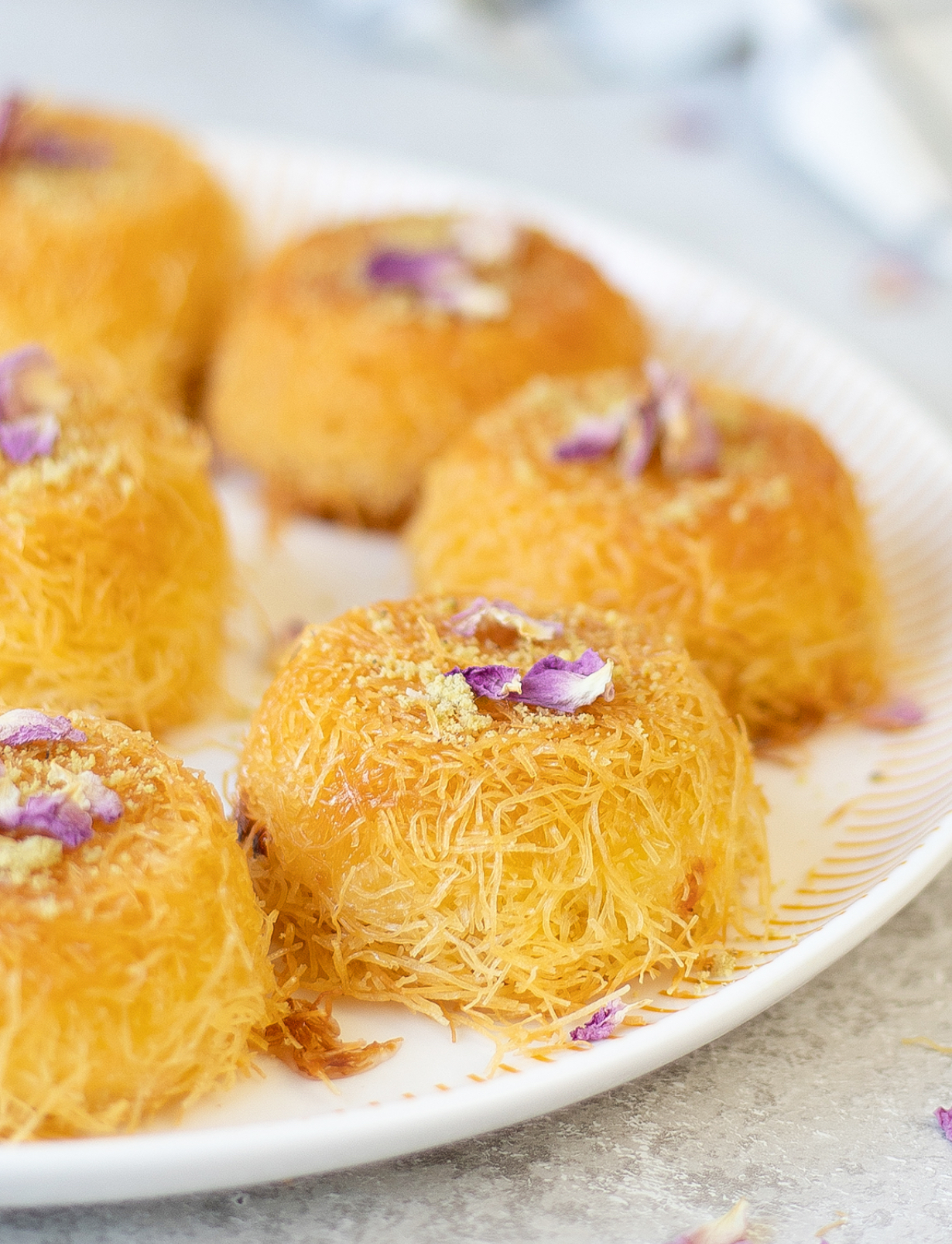 A delicious Middle Eastern dessert made with shredded kunafah dough, layered with creamy cheese or nuts, soaked in sweet rose syrup, and baked until crispy and golden — a perfect balance of textures and flavors.