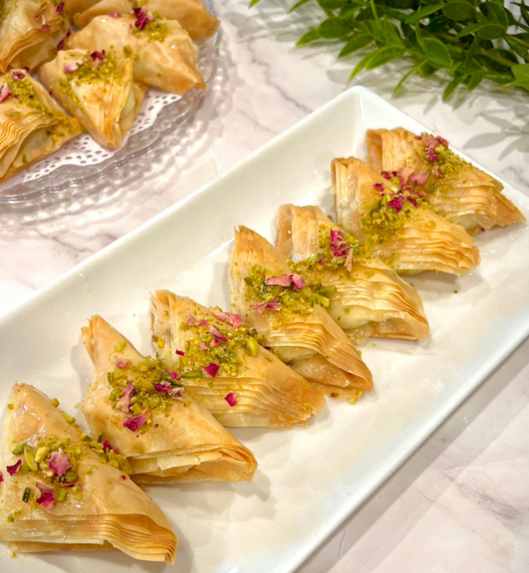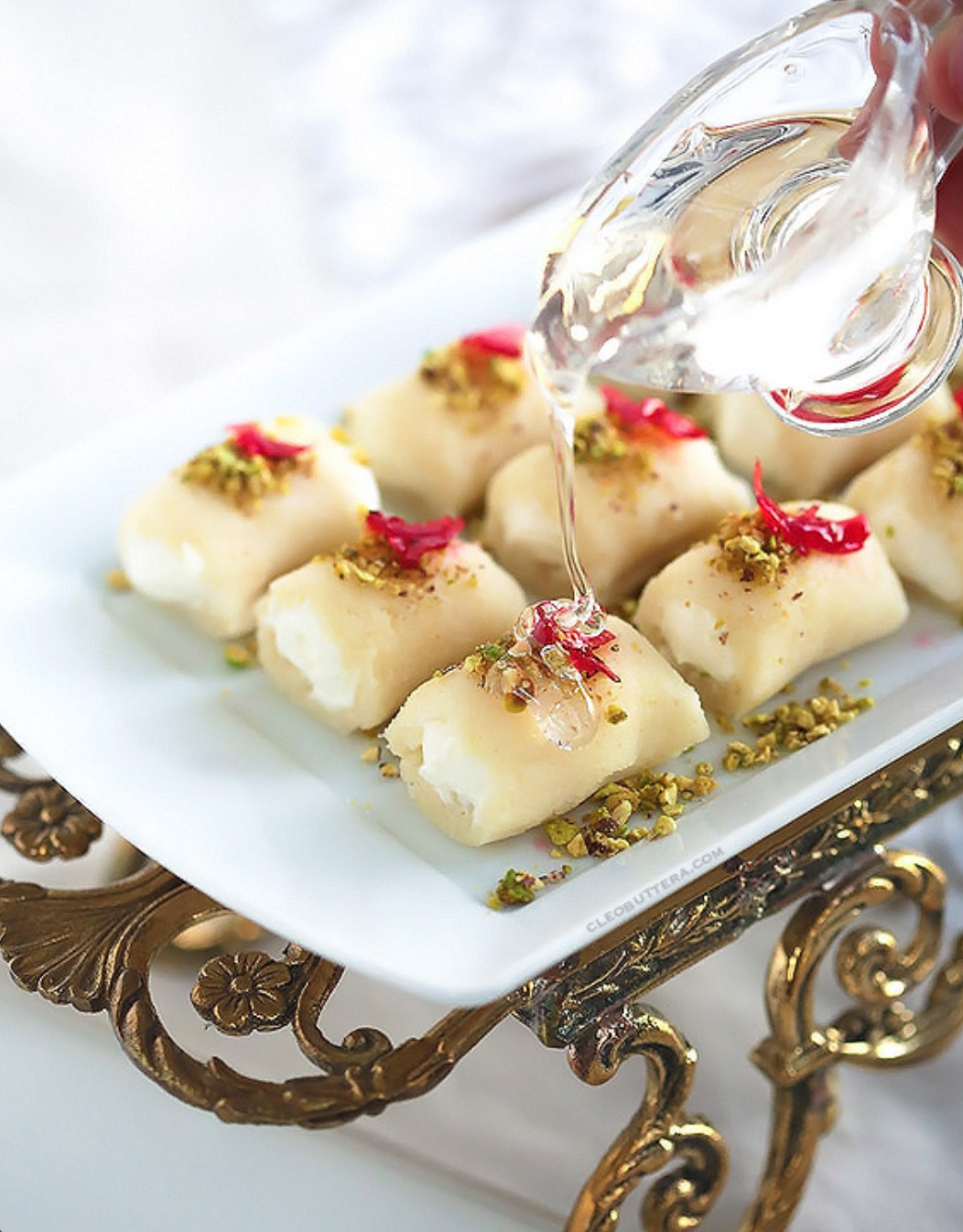 Crispy phyllo dough rolls filled with rich clotted cream or custard, drizzled with syrup, and often garnished with pistachios — a decadent and indulgent treat.