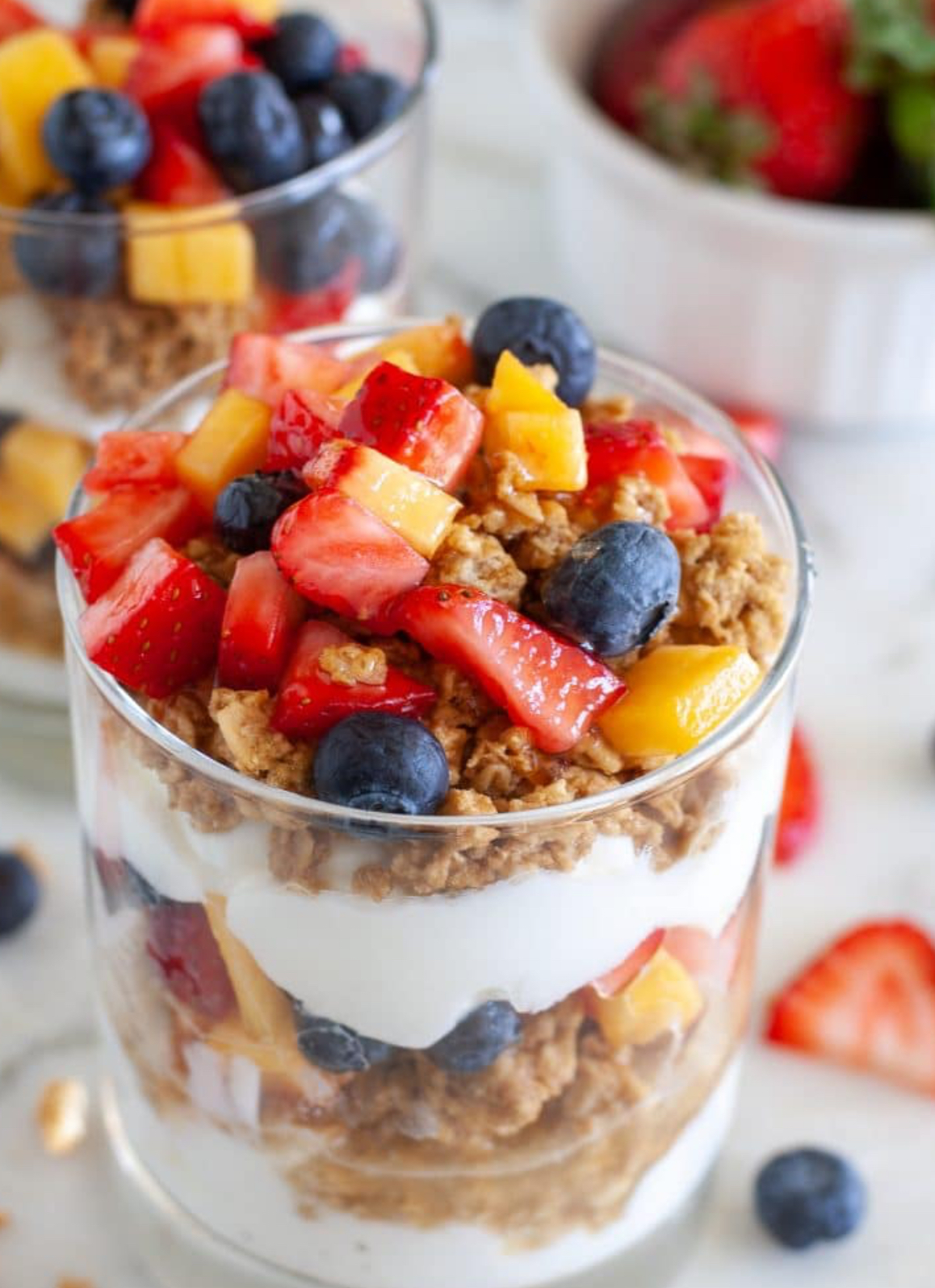 Layers of yogurt or custard, fresh fruits, and granola or nuts, served in clear cups — a refreshing and wholesome sweet treat.