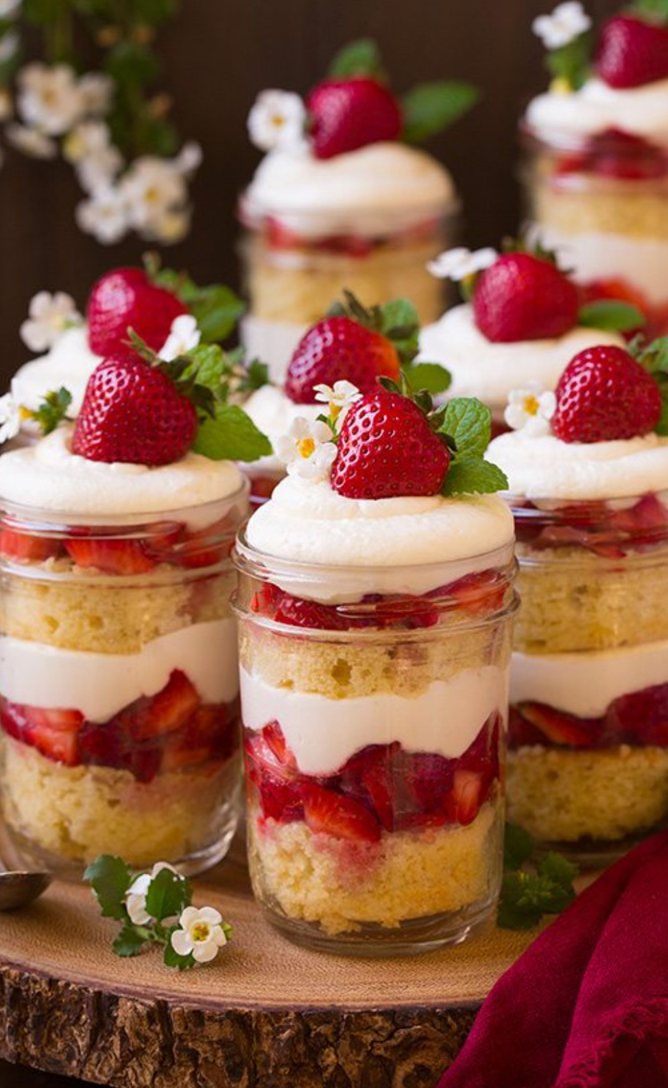 Layers of sponge cake, custard, fruit, and whipped cream, served in individual cups — a classic British dessert with a playful twist.