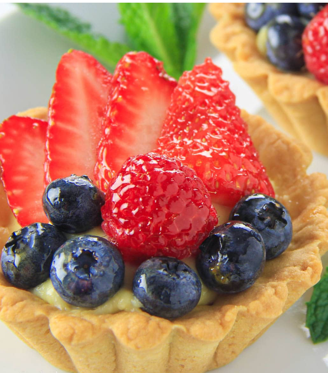 A buttery tart shell filled with silky pastry cream and topped with a vibrant assortment of fresh fruits — an elegant and delightful dessert with a perfect balance of sweetness and crunch.