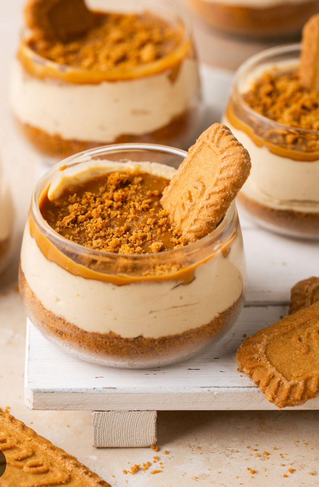 Creamy cheesecake filling nestled in a graham cracker crust, served in individual cups and topped with fresh berries or caramel — a delightful, portion-sized treat.