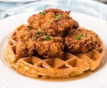 Sweet and savory chicken atop fluffy waffles — a playful combination.