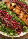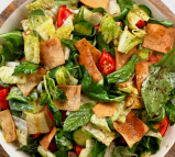 A colorful Mediterranean salad featuring crisp greens, juicy vegetables, and crunchy toasted pita, tossed with a tangy sumac and lemon dressing — a perfect balance of textures and flavors.