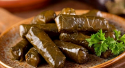Tender grape leaves wrapped around herbed rice — a delicate, tangy bite of freshness.